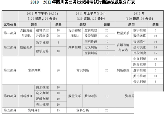1.總題量為20道。和2010年相比,常識(shí)判斷部分的考查有了很大的調(diào)整,不僅題量增加了15道,更是將其從判斷推理當(dāng)中抽取出來作為一大專項(xiàng)單獨(dú)考查,體現(xiàn)了四川省公務(wù)員考試命題的日益完善。
