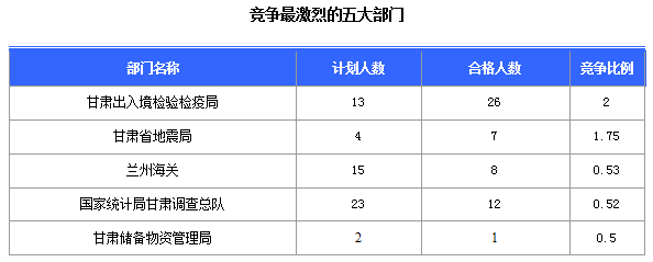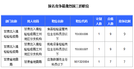 報(bào)名通過(guò)審核人數(shù)前五的職位主要集中在甘肅省出入境檢驗(yàn)檢疫局、甘肅省地震局、蘭州海關(guān)等部門,具體信息如下: