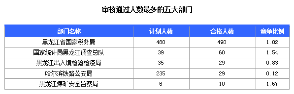 截止15日17時,通過審核人數前三位的部門依次是:黑龍江省國家稅務局、國家統計局黑龍江調查總隊、黑龍江出入境檢驗檢疫局,三部門通過審核總人數達579人,占通過審核總人數的91.9%。