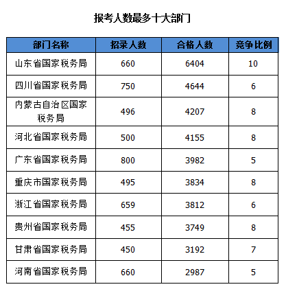 與上午九時(shí)數(shù)據(jù)相比,報(bào)名人數(shù)最多十大部門清一色為國稅部門,報(bào)名人數(shù)最多的山東國稅,招660人,共6404人報(bào)名,報(bào)名人數(shù)翻倍增長,目前競爭最激烈的部門是內(nèi)蒙古地震局,招錄3人,已經(jīng)有581人報(bào)名,成為截止目前最“擁堵”的部門。