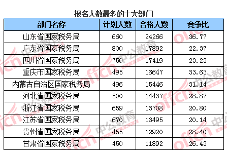 截止到21日17時(shí),稅務(wù)系統(tǒng)共通過(guò)審核319167人,占總通過(guò)審核人數(shù)的51.8%——實(shí)實(shí)在在的“半壁江山”。其中,山東國(guó)稅“一馬當(dāng)先”,過(guò)審人數(shù)兩萬(wàn),達(dá)到24266人,平均競(jìng)爭(zhēng)比為36.77:1。