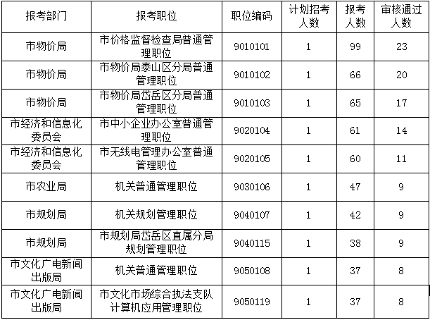 由以上分析可以看出,報名最熱的前三個職位全部為物價局普通管理職位,中公教育數(shù)據(jù)研究專家提醒各位考生,一定要在清晰了解各職位報名情況后理性選擇職位 進(jìn)行報考,為幫助考生避開過熱崗位,考試幾率,現(xiàn)將審核通過人數(shù)排名前十位的職位、報考人數(shù)前十位的職位以及報考人數(shù)為零的職位總結(jié)如下: