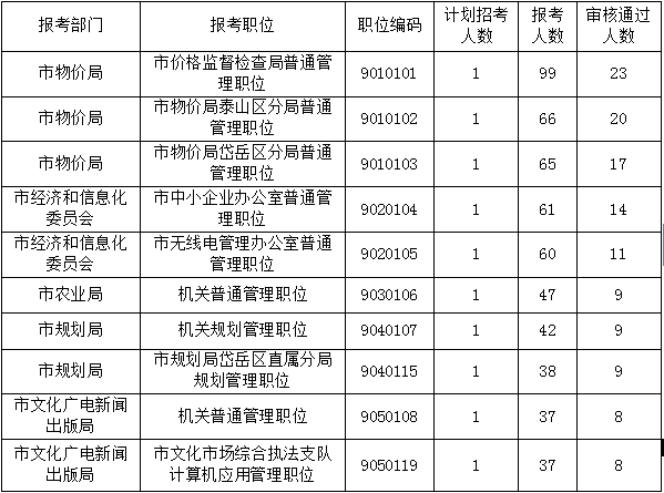 2016年泰安市所屬的職位中,報考人數(shù)前三位的職位分別是:市價格監(jiān)督檢查局普通管理職位、市物價局泰山區(qū)分局普通管理職位、市物價局岱岳區(qū)分局普通管理職位,報考人數(shù)分別為99、66、65人。