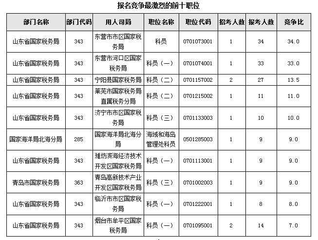 截止15日16時,報考人數最多職位為東營市市區國家稅務局一職,招考1人,通過審核人數為34人。競爭比的職位也是東營市市區國家稅務局一職,競爭比已達34:1。