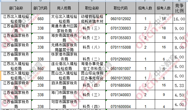 報名通過審核人數前十的職位主要集中在江蘇省國家稅務局、江蘇出入境檢驗檢疫局部門,具體信息如下: