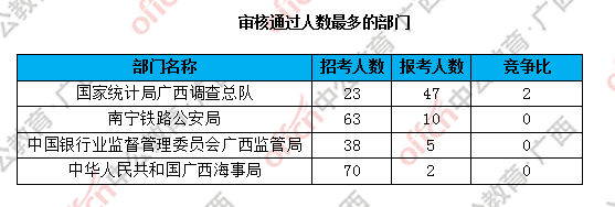 為幫助廣大考生更清晰的了解今日過審情況,廣西中公網(wǎng)校整理了過審人數(shù)前四位的部門,供廣大考生參考: