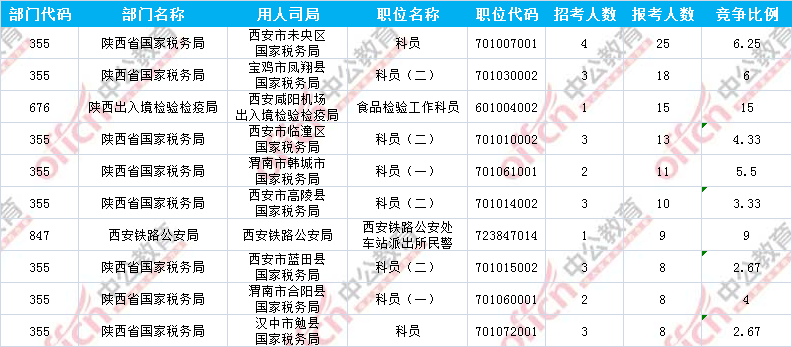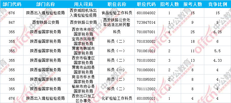 報(bào)名通過(guò)審核人數(shù)前十的職位主要集中在陜西省國(guó)家稅務(wù)局、陜西出入境檢驗(yàn)檢疫局、西安鐵路公安局等部門,具體信息如下: