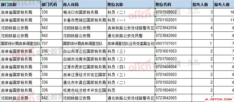 報名通過審核人數前十的職位主要集中在吉林省國稅局和沈陽鐵路局部門,具體信息如下: