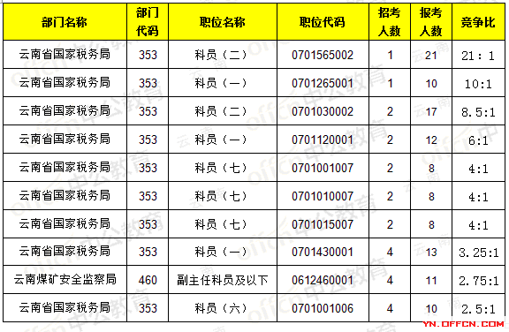 截止15日17時,招錄比例的職位為云南省國家稅務局,職位代碼是0701565002,招錄1人,通過人數21人,競爭比21:1 。