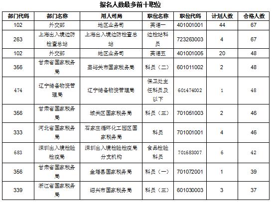 報名首日的人氣前十榜單涵蓋了外交部、國稅、出入境邊防檢查總站、遼寧儲備物資管理局等各個部門,其中,外交部地區業務司英語一(職位代碼401001001),上海出入境邊防檢查總站邊檢站科員(職位代碼723263003)這兩個職位目前均擁有了67個“粉絲”,可謂首日的“人氣雙星”,外交部地區業務司英語一(職位代碼401001001)這一職位招錄44人,規模較大,且英語屬于大語種,符合條件的考生較多。