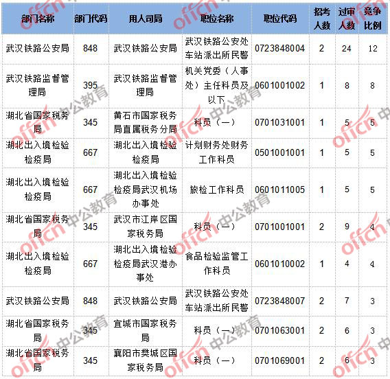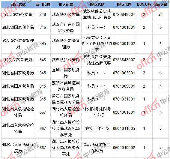 截止到10月15日16時,報名通過審核人數(shù)和競爭比例的職位同為武漢鐵路公安處車站派出所民警一職,招錄2人,過審人數(shù)24人,競爭比例為12:1。具體信息如下: