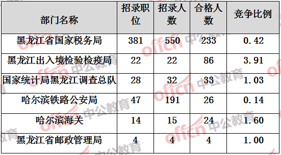 為幫助廣大考生更清晰的了解今日報(bào)名情況,黑龍江中公網(wǎng)校整理了審核通過人數(shù)前六位的部門以及競爭比例最激烈的六大部門,供廣大考生參考:
