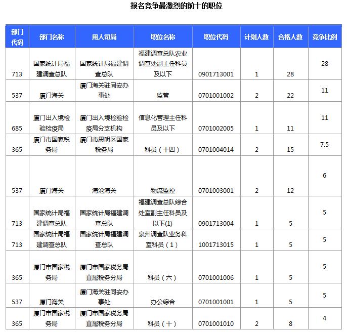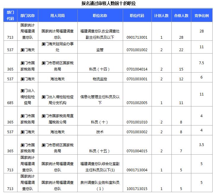 報名通過審核人數前十的職位主要集中在國家統計局福建調查總隊、廈門海關駐同安辦事處、廈門市思明區國家稅務局等部門,具體信息如下: