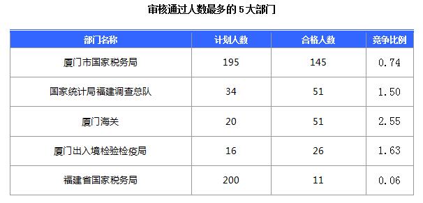 截止到15日16時,通過審核人數前三位的部門依次是:廈門市國家稅務局、國家統計局福建調查總隊局、廈門海關,三部門通過審核總人數達247人,占通過審核總人數的87%。