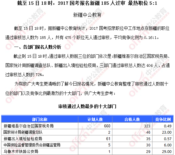 【截至15日16時】2017國考報名新疆185人過審 475個職位無人報考