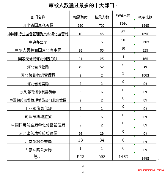 為幫助廣大考生更清晰的了解今日報名情況,河北中公網校整理了審核通過人數前十位的部門以及競爭比例最激烈的十大部門,供廣大考生參考: