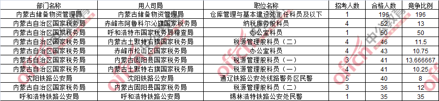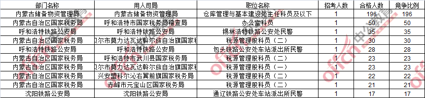 報(bào)名通過(guò)審核人數(shù)前十的職位主要集中在內(nèi)蒙古儲(chǔ)備物資管理局、赤峰市阿魯科爾沁旗國(guó)家稅務(wù)局、呼和浩特市國(guó)家稅務(wù)局稽查局等部門(mén),具體信息如下: