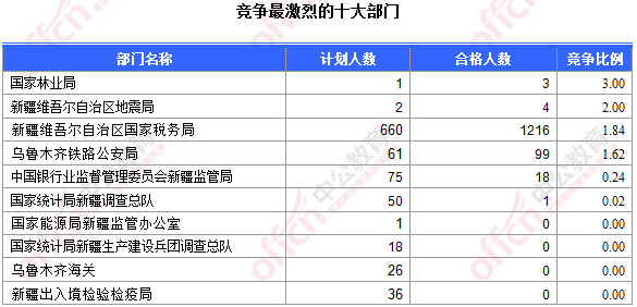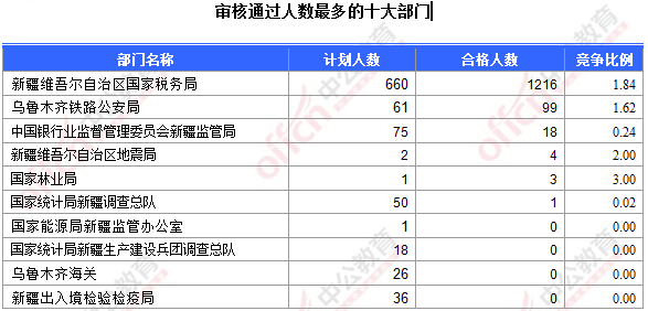 為幫助廣大考生更清晰的了解今日報名情況,新疆中公網校整理了審核通過人數前十位的部門以及競爭比例最激烈的十大部門,供廣大考生參考: