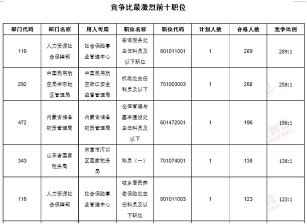 在競爭力最強前十職位中,有兩個職位均來自人力資源社會部,其中人力資源社會部社會保險事業管理中心咨詢服務處主任科員及以下職位(代碼801011001)這一職位取代了遼寧儲備物資管理局保衛處主任科員及以下(職位代碼601474002)的“寶座”地位,成為今日最難考職位,競爭比例已高達289:1,該職位處于中央機關,前景廣闊,且招錄條件相對寬松,很有可能制造“千里挑一”的局面。