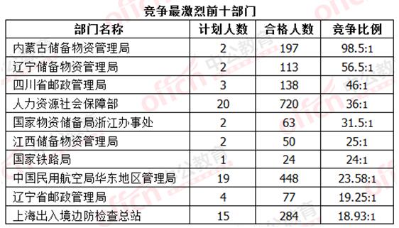 內蒙古儲備物資管理局取代遼寧儲備物資管理局,躍居為競爭最激烈前十部門榜單首位,僅招錄2人,已經197人通過審核,競爭比高達98.5:1, 遼寧儲備物資管理與局四川省郵政管理局也有上升趨勢,未來到底誰主沉浮,請考生們繼續關注中公網校每日國考報名數據分析。