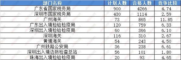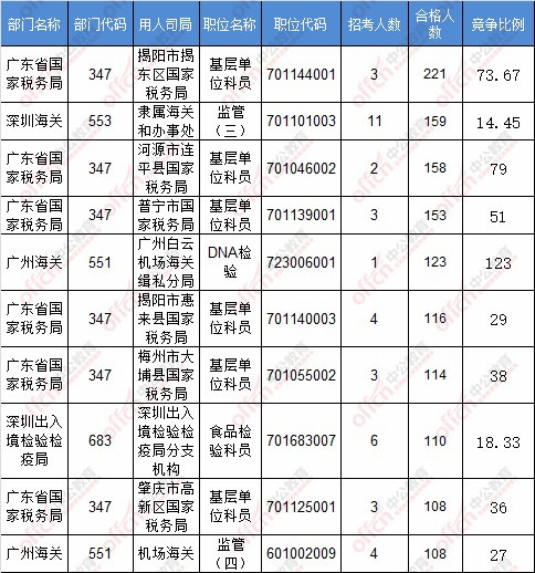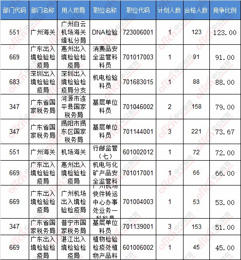 報(bào)名通過審核人數(shù)前十的職位主要集中在廣州海關(guān)、廣東出入境檢驗(yàn)檢疫局、深圳出入境檢驗(yàn)檢疫局等部門,具體信息如下: