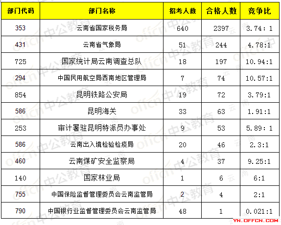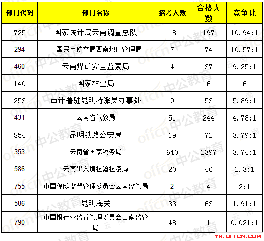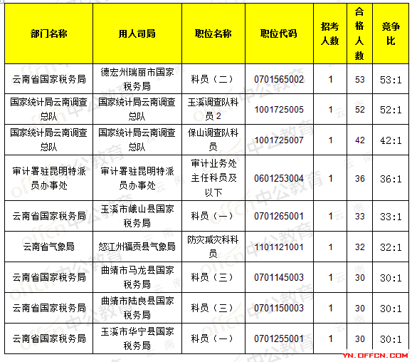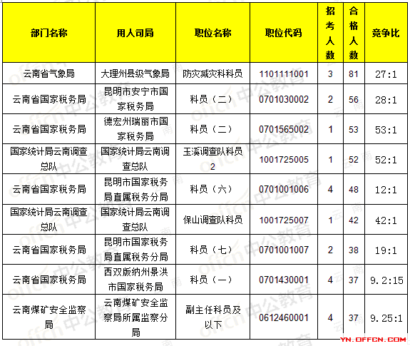 報(bào)名通過(guò)審核人數(shù)前十的職位主要集中在云南省國(guó)家稅務(wù)局、云南煤礦安全監(jiān)察局,具體信息如下:
