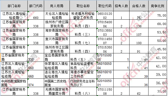 截止到17日8時,競爭比例的職位為江蘇出入境檢驗檢疫局太倉出入境檢驗檢疫局動植物檢驗檢疫科進境木材檢驗鑒定工作科員一職,招錄1人,截止到17日8時通過人數為75人。