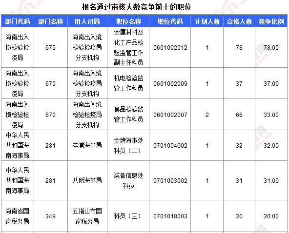 截止到17日8時,已有119個職位破0,且熱門職位人數競爭已經開始激烈,其中報名人數最多的職位為:海南出入境檢驗檢疫局,機電檢驗監管工作科員,共報名78人,競爭比例已高達78:1!
