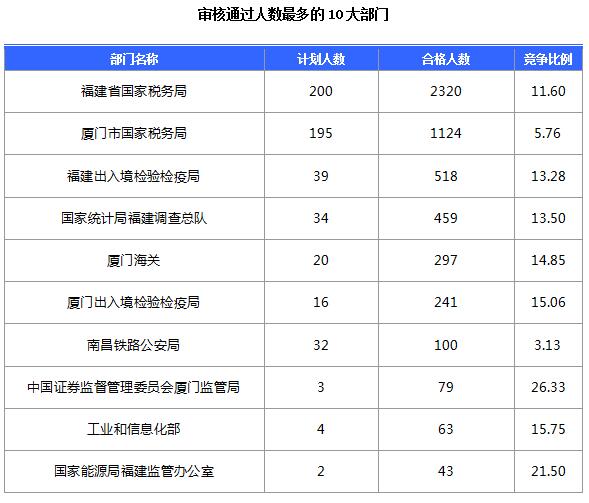 截止到17日16時(shí),通過(guò)審核人數(shù)前三位的部門(mén)依次是:福建省國(guó)家稅務(wù)局、廈門(mén)市國(guó)家稅務(wù)局、福建出入境檢驗(yàn)檢疫局,三部門(mén)通過(guò)審核總?cè)藬?shù)達(dá)3962人,占通過(guò)審核總?cè)藬?shù)的74%。