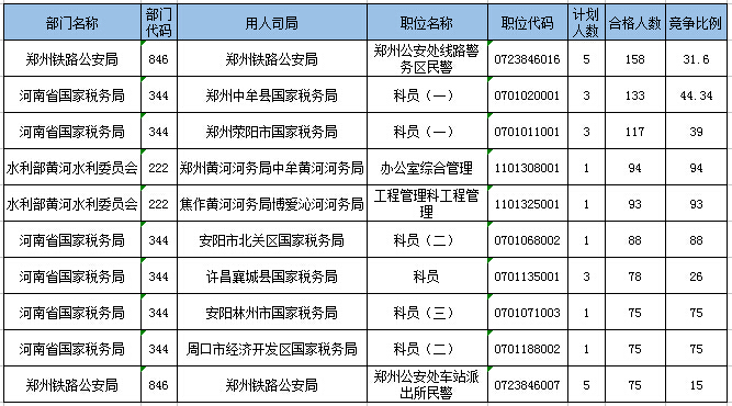 報名通過審核人數排名前列的職位主要集中在鄭州鐵路公安局、河南省國家稅務局,水利部黃河水利委員會,具體信息如下: