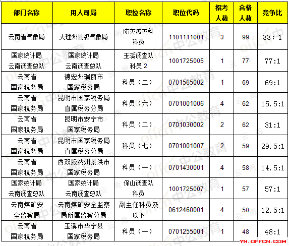 報名通過審核人數前十的職位主要集中在云南省氣象局、國家統計局云南調查總隊、云南省國家稅務局等部門,具體信息如下: