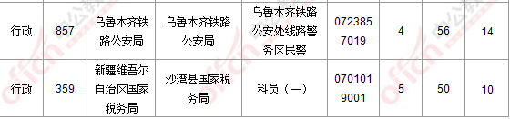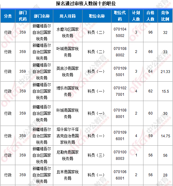 報(bào)名通過(guò)審核人數(shù)前十的職位主要集中在新疆維吾爾自治區(qū)國(guó)家稅務(wù)局、烏魯木齊鐵路公安局等部門,具體信息如下: