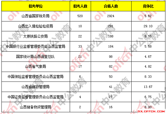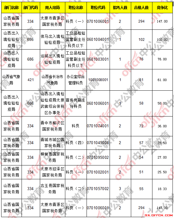 報考人數(shù)前十的職位主要集中在山西省國家稅務(wù)局、山西出入境檢驗檢疫局這兩個部門,具體信息如下: