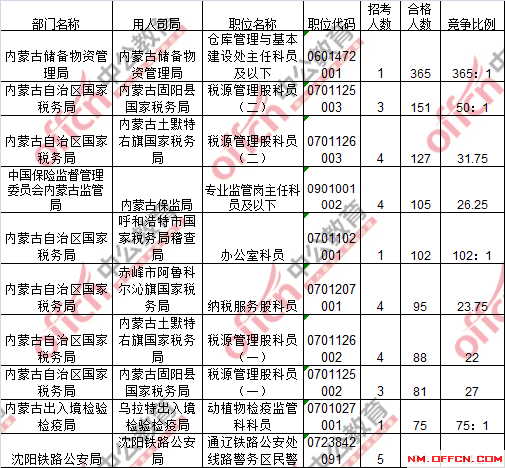 截止到18日8時,競爭比例的職位為內蒙古儲備物資管理局倉庫管理與基本建設處主任科員及以下一職,招錄1人,截止到18日8時通過人數為365人!