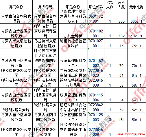 報名通過審核人數前十的職位主要集中在內蒙古儲備物資管理局、內蒙古固陽縣國家稅務局、內蒙古土默特右旗國家稅務局等部門,具體信息如下: