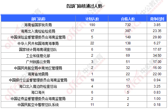 為幫助廣大考生更清晰的了解今日?qǐng)?bào)名情況,海南中公網(wǎng)校整理今天各部門的報(bào)名情況供廣大考生參考:
