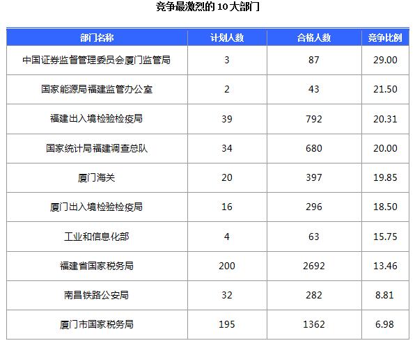 為幫助廣大考生更清晰的了解今日報名情況,福建中公網校整理了審核通過人數前10位的部門以及競爭比例最激烈的10大部門,供廣大考生參考: