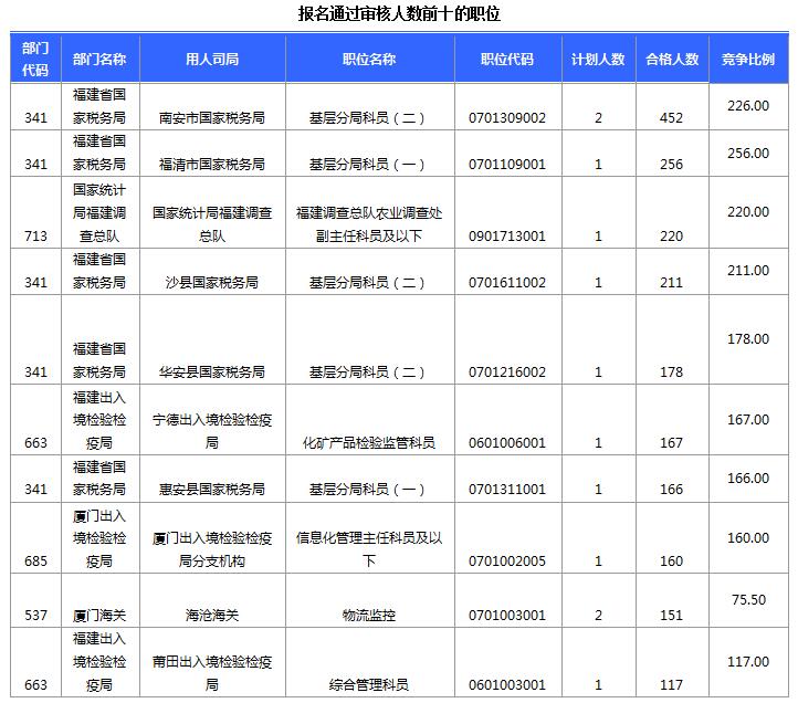 報名通過審核人數(shù)前十的職位主要集中在南安市國家稅務(wù)局、福清市國家稅務(wù)局、國家統(tǒng)計局福建調(diào)查總隊等部門,具體信息如下: