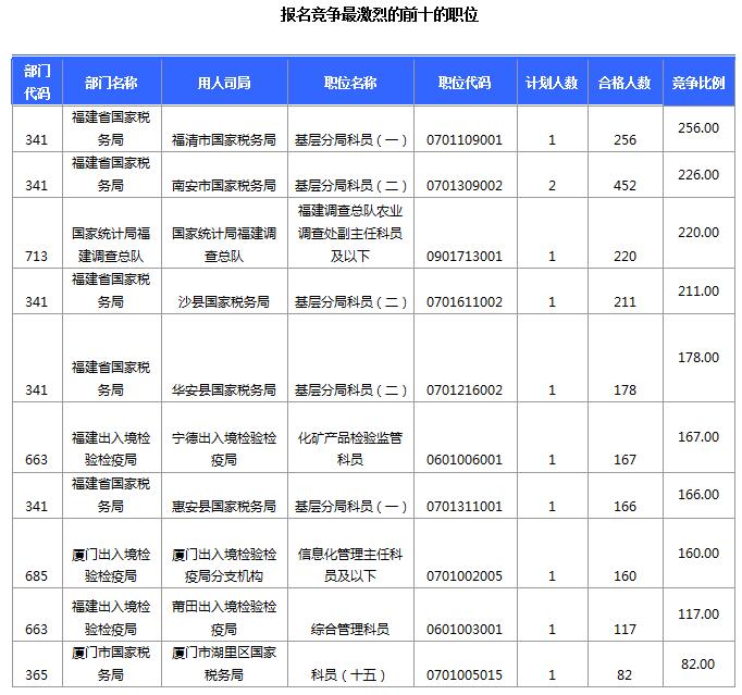 截止到18日8時,競爭比例的職位為福建省國家稅務(wù)局福清市國家稅務(wù)局基層分局科員(一)一職,招錄1人,截止到18日8時通過人數(shù)為256人