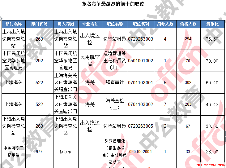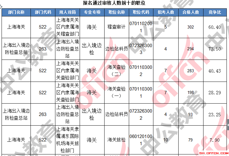 報名通過審核人數前十的職位主要集中在上海出上海海關、上海出入境邊防檢查總站、中國民用航空局華東地區管理局,具體信息如下: