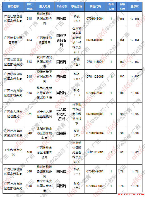 報名通過審核人數前十的職位主要集中在廣西壯族自治區國家稅務局、廣西儲備物資管理局、廣西出入境檢驗檢疫局等部門,具體信息如下: