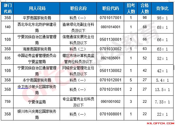 截止到18日16時,競爭比例的職位為平羅縣國家稅務局科員(一)一職,招錄1人,截止到18日16時合格人數為98人,具體信息如下:
