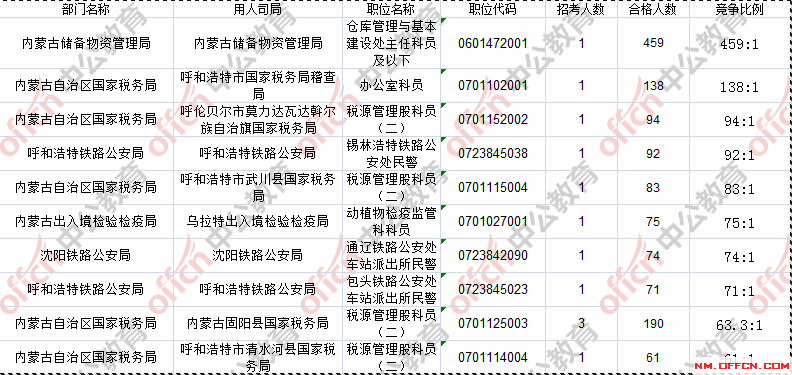 報名通過審核人數前十的職位主要集中在內蒙古儲備物資管理局、內蒙古固陽縣國家稅務局、內蒙古土默特右旗國家稅務局等部門,具體信息如下: