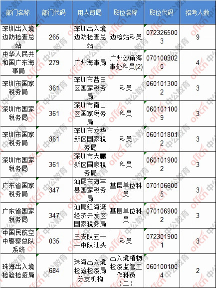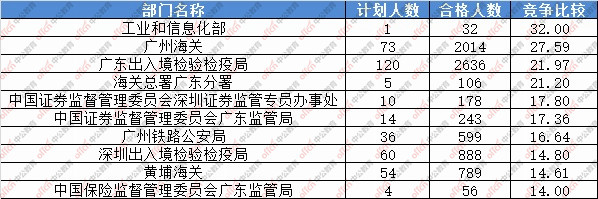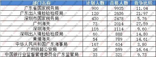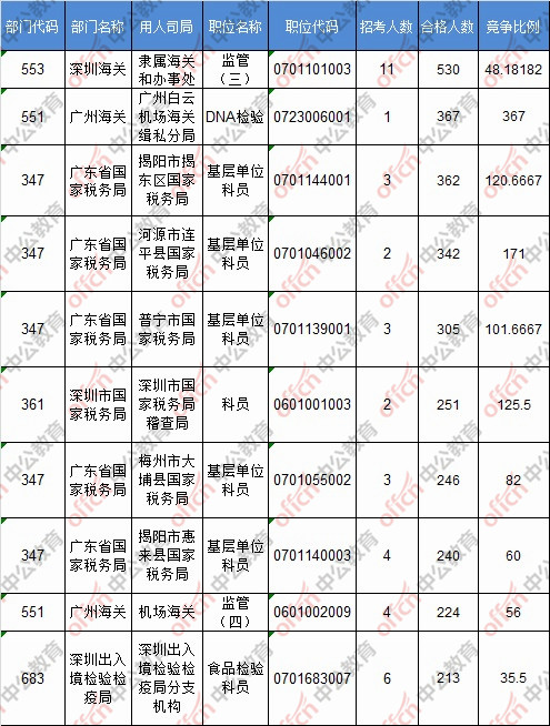 報(bào)名通過(guò)審核人數(shù)前十的職位主要集中在深圳海關(guān)、廣州海關(guān)、廣東省國(guó)家稅務(wù)局,具體信息如下: