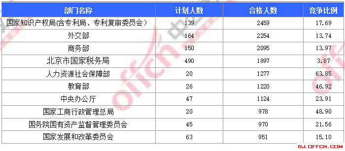 為幫助廣大考生更清晰的了解今日報名情況,北京中公網校整理了合格人數前十位的部門以及競爭比例最激烈的十大部門,供廣大考生參考: