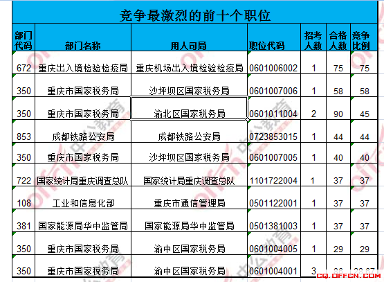 截止到18日16時,競爭比例的職位為‘重慶機場出入境檢驗檢疫局’一職,招錄1人,截止到18日8時通過人數為75人。但是還有少數崗位沒有人去報名。