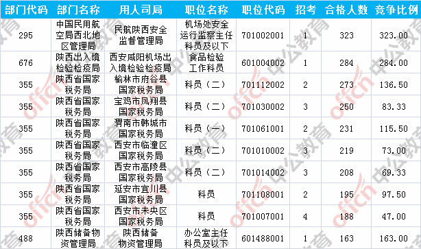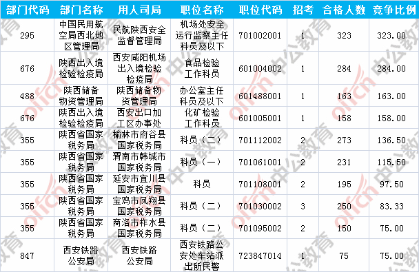 報名通過審核人數(shù)前十的職位主要集中在陜西出入境檢驗檢疫局、陜西省國家稅務局、中國民用航空局西北地區(qū)管理局等部門,具體信息如下: