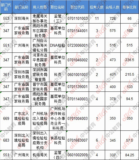 報名通過審核人數前十的職位主要集中在深圳海關、廣東省國家稅務局、廣州海關,具體信息如下: