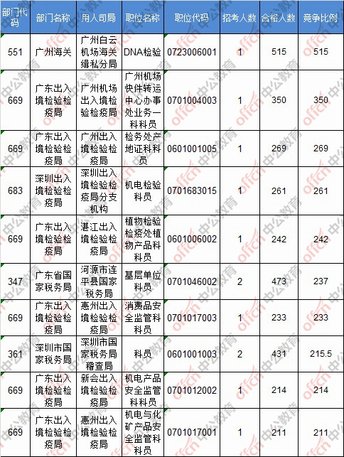 截止到20日8時,競爭比例的職位為廣州海關廣州白云機場海關緝私分局DNA檢驗一職,招錄1人,截止到20日8時通過人數為515人。