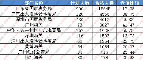 為幫助廣大考生更清晰的了解今日報名情況,廣東中公網校整理了審核通過人數前十位的部門以及競爭比例最激烈的十大部門,供廣大考生參考: